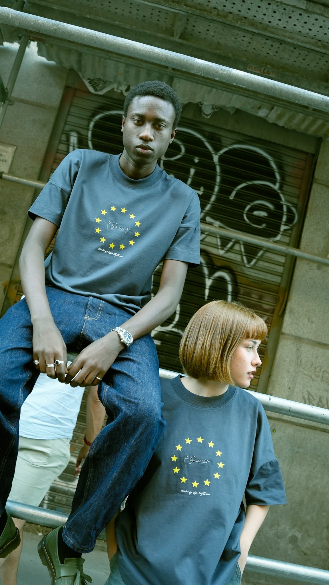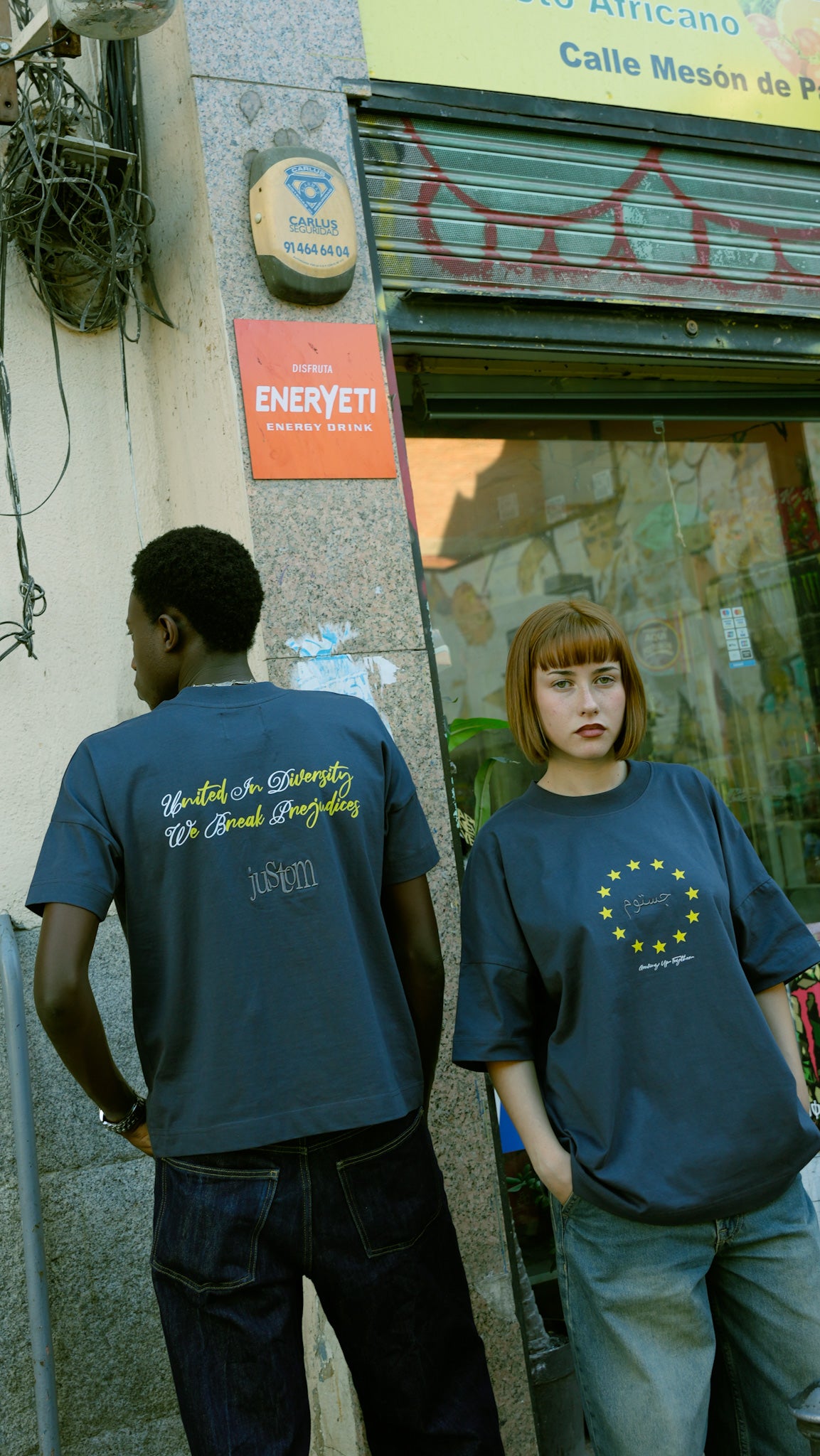EN LA ESPALDA, EL MENSAJE “UNIDOS EN LA DIVERSIDAD, ROMPIENDO PREJUICIOS” CON EL JUSTOM EN BORDADO DEBAJO.